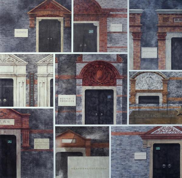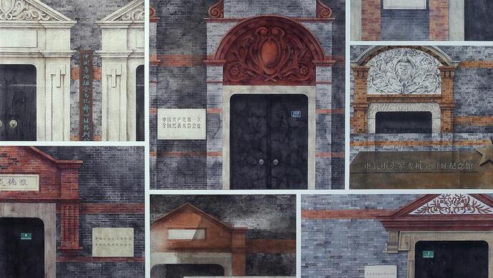 尽管是感性的艺术作品,但展出作品的每一处细节,都经过了反复推敲。洪健的《上海·红色起源地》,由9个独立的小画面组成,包括一大会址、二大会址、四大旧址,还有《新青年》杂志旧址、共青团成立初期的处所、一大代表开会时所住的宿舍等。洪健说,这些场所具有两个共同点,“一是中国共产党从筹备阶段到成立初期的大部分活动都发生在上海这座城市,另一个则是这些事件都是在富有江南文化气息且是上海代表性建筑——石库门里发生的。”
