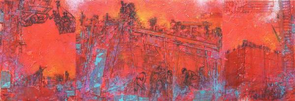 值得一提的是,展出作品中不乏多件外地艺术家以及自由职业艺术家的作品。来自浙江美术馆的周蕴智创作了版画《中苏友好大厦竣工》,来自中国美术学院的刘元捷带来雕塑《上海空嫂》,来自温州大学的李利民带来水彩画《江南造船厂再创辉煌》,来自山西大同大学的王文星带来油画《上海支援大三线建设》,自由职业艺术家邓翰墨、王蓉、罗辑等分别创作油画《上海迪士尼》《董家渡旧区改造》《盾构装备施工》等。