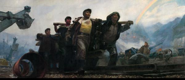 “六亿神州尽舜尧(社会主义革命和建设时期)”篇章选取了在迎接新中国、新生活的历史背景下,中国人民朝阳似火、鼓足干劲的建设画面。解文金《吉祥里生产组》、颜文樑《闵行在建设中》、陈逸飞《开路先锋》、尹呈忠《工人住进了新村》等作品色彩鲜明、内容突出,细节生动,让观者直观感受到社会主义国家建设的火热气氛。另一方面,丰子恺《庆千秋》、王个簃《走向生活》、张培础《闪光》等国画作品,则运用传统中国画技法巧妙传达了工业建设时期人民的精神面貌,别有一番淳朴、自然的美感。另外,贺友直连环画《山乡巨变》、沈柔坚版画《船坞中》等老百姓喜闻乐见的作品,使整个版块充满了鲜明的时代特色和浓厚的人文气息。