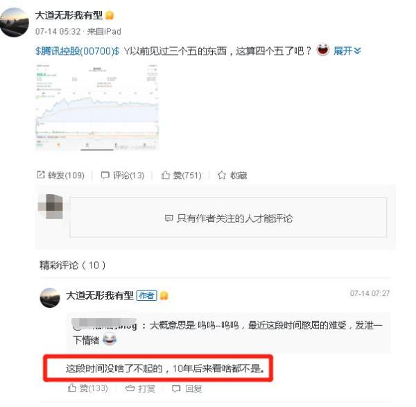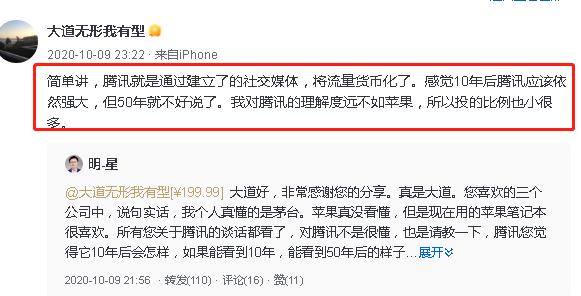 他表示,10年后回过头来看腾讯赚的钱(我买的份额占的比例)应该比我存银行的利息要多。