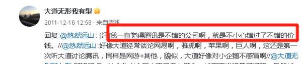 据网友整理,段永平首次在雪球上讨论腾讯,是在2010年12月,当时有网友提问:貌似大道好像对小企鹅不感冒啊?