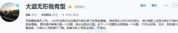 资料显示,段永平的雪球账号有超42万粉丝。简介中他表示:"买股票就是买公司。我喜欢的公司我会说的,不用问。"