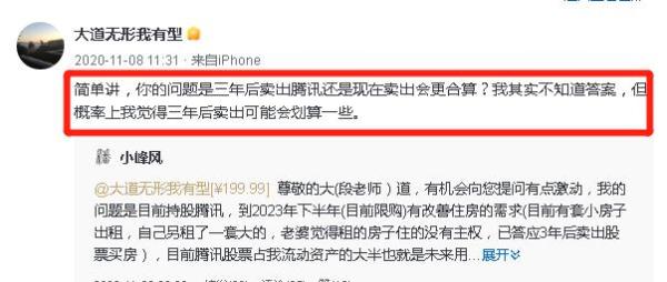 11月,段永平称,“三年后卖出腾讯(港股)还是现在卖出会更合算?我其实不知道答案,但概率上我觉得三年后卖出可能会划算一些。”