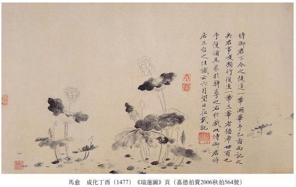 幸运的是,2006年秋天,中国嘉德秋拍之际,我意外见到第564号拍品正是马愈的《瑞莲图》,这件拍品在那次拍卖中流拍,后被私家购入。这件作品纵30.5厘米、横58.3厘米,裱以镜心形制。作品以水墨写意,莲叶疏密相间,墨色浓淡不一,风姿绰约。淡墨线条勾画的莲花,轻盈高洁,有馨香弥漫之感。奇妙的是,马愈画完“一蒂两花”后,王濬的莲花竟复生“一蒂三花”,马愈又补其像于骈萼之右,成为现今存世的这件作品。画上与《畿甸观风图》卷一样钤有“丁”“酉”朱文联珠印。
