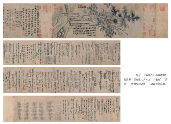 画中还透露了一个故事:沈恒将父亲沈澄所藏元代画家缪佚作品《山泾杂树图》轴给马愈观摩,并请他题字于卷后,马愈欣然执笔写下两首绝句。不仅如此,马愈还兴致盎然地把原作带回家,耗时两晚对临卷中七十八首诗,第三天又临摹画作,甚至卷中六十八枚印章,他也一一对临摹刻并钤上。值得一提的是,马愈的书画鉴藏造诣亦为后人所称颂,将其与赵孟坚、文徵明、项元汴等重要鉴藏家并列。文献记载其藏品包括宋高宗赵构《楷书徽宗论文集序》卷、赵孟頫《临王右军十七帖》、黄庭坚《书阴真君诗》以及《书后汉阴长生诗三首》等。