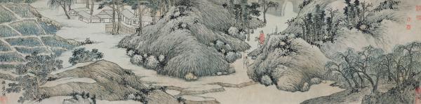 《畿甸观风图》卷纵29厘米、横115.6厘米,纸本浅绛。图中山峦平伏舒缓,草木葱翠欲滴,林间屋舍俨然,窗内人物悠然,路旁稻禾青葱郁茂,一派江南城郊景致。城墙外,一红袍官员简装束行,二三仆侍随从,行色匆匆。画卷笔墨俨整,以披麻皴为主,其磊落凝重之笔趣,颇类沈周中晚年之后风格,为典型的明代早期吴门文人画风。吴门画派创始人沈周是江苏苏州人,出身于富裕的书香绘画世家,一生家居读书、吟诗作画、优游林泉,追求精神上的自由,从未应科举征聘,始终过着田园隐居生活。