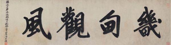 图中本幅楷书款署“痴痴道人”,钤“清痴”朱文印记。卷首马愈行书引首“畿甸观风”四大字,署“赐进士第承德郎南京刑部主事西吴马愈题”,钤“抑之”白文方印、“丁”“酉”朱文联珠印、“天玉亭”朱文长方三印记。根据卷中鉴藏印所知,作品曾由明代鉴藏家朱之赤、近代书画藏家钱镜塘收藏。