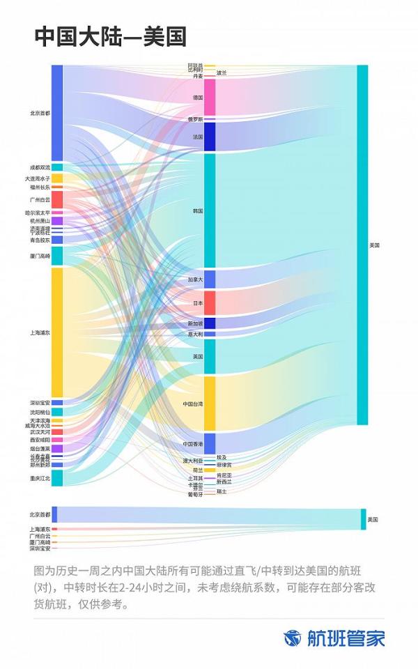 航班管家统计图显示,中国大陆抵达美国的直飞航班仅占很小一部分,多数要从韩国、台湾、香港、日本等地进行中转。