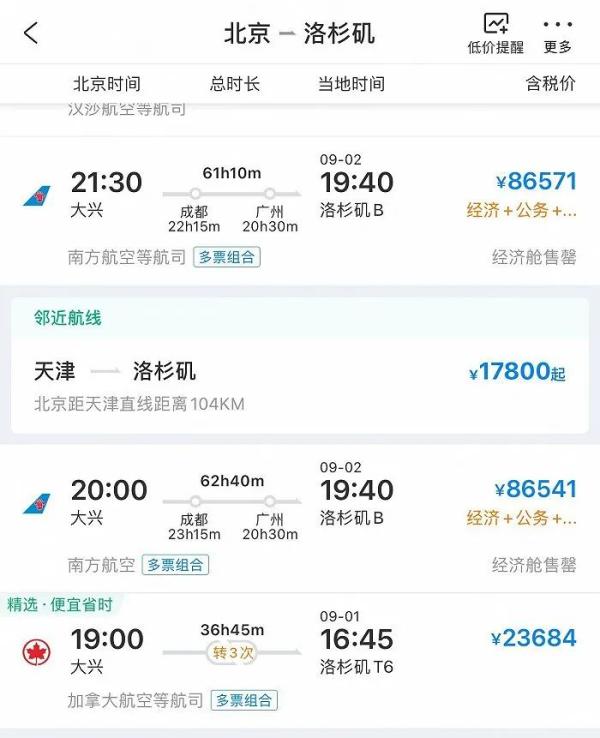其余航空公司的线路均需中转两个以上的城市,耗时更长。以南航大兴-洛杉矶8月31日航班为例,经济舱已经售罄,在经济舱+公务舱+头等舱多票组合下,票价达到86571元。