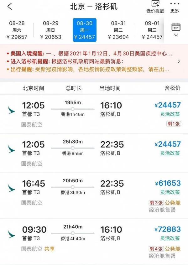 界面新闻记者在携程搜索发现,未来半个月内,北京-洛杉矶航线几乎没有直飞航班可供选择。国泰航空承运航班耗时相对较短,仅需中转一次,被热抢。8月30日国泰航空首都-洛杉矶航班经济舱票价为24457元,部分航班经济舱售罄,公务舱仅余4张机票,价格高达72883元。