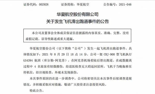 当日晚间,华夏航空发布《关于发生飞机滑出跑道事件的公告》,公告表示,8月29日18点14分,公司一架 CRJ-900 型飞机执行 G54394 航班(库尔勒-阿克苏),在阿克苏机场着陆后滑出跑道。在疏散撤离过程中 4 名旅客有轻微擦伤,经送医检查无大碍返回居所。飞机于当晚拖移至停机位,经目视检查,外观未发现损伤。