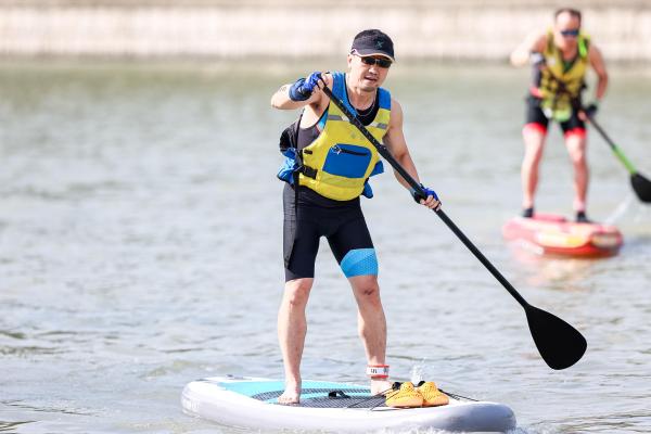相比业余选手重在参与的心态,专业选手则都是有备而来,对赛事有着更高的要求。53岁的张继革身穿上海交通大学比赛服,比赛结束后神情轻松。“这次交大有7个选手参赛,其中6个是在职教师。我是大学龙舟队队长,也经常参加铁三比赛。这次感觉赛道非常完美,赛前的技术交流会也很细致,组委会重新铺设赛道,基本挑不出毛病。”