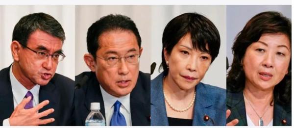 这是9月17日在日本东京拍摄的日本自民党总裁候选人河野太郎、岸田文雄、高市早苗和野田圣子(从左至右)(拼版照片)。新华社/法新