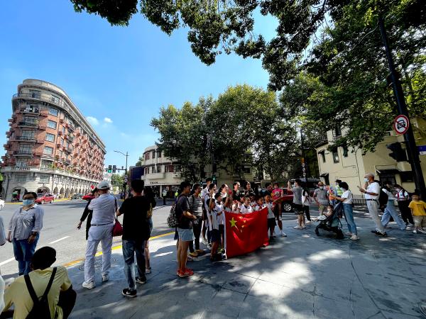 今年国庆,游人手举国旗与武康大楼合影。 舒抒 摄
