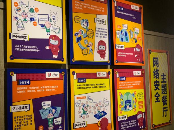 主题餐厅从布置上就别具一格。入口处的玻璃墙和玻璃门贴满了“防恶意软件”“防漏洞攻击”“防钓鱼WI-FI”等海报,市民用餐的餐桌上贴着卡通桌贴。仔细看,这些形式丰富的文宣产品都是一些科普小故事和小贴士,以青少年喜爱的方式传递着网络安全的硬核知识。