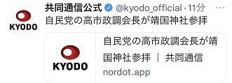 日本共同社刚刚消息,靖国神社17日至18日举行秋季例行祭典,自民党政调会长高市早苗18日参拜了靖国神社。