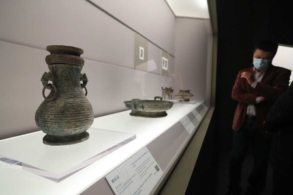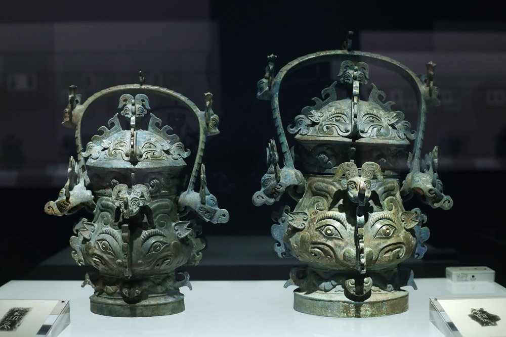“文物之美,在于艺术价值、科学价值与历史价值的统一。”与噩侯方罍比邻的兽面纹卣一组两件,在“神面纹”基础上,多了华美奇诡的装饰,铸造工艺十分复杂,是噩国青铜器代表之一。目前已有研究者运用先进的扫描技术,探究和还原当年的铸造技艺。