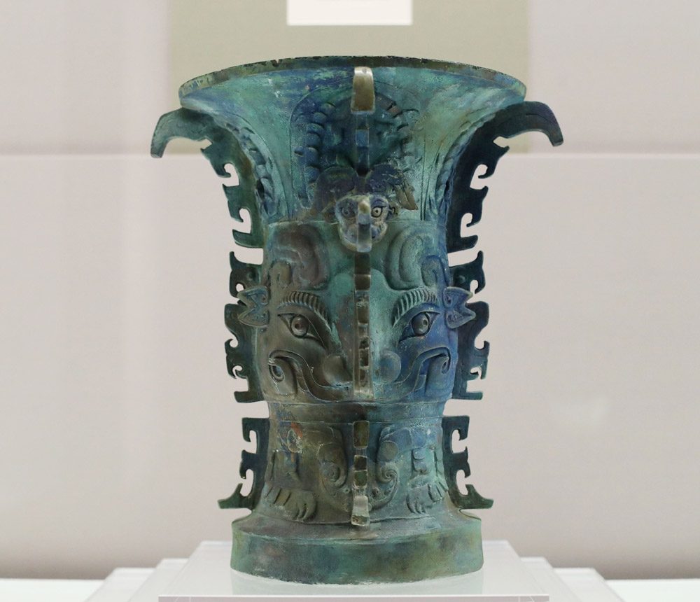 “神面纹”是噩国青铜器独一无二的特征。与噩侯方罍相对应的兽面纹尊,除了独特的“神面纹”,细看器皿一侧,既显露出青铜本身的金色,又覆盖着泛蓝的锈色,一些区域甚至呈现出独特的紫色。据介绍,这样独特的锈色也是噩国青铜器的特征之一,因制作工艺、掩埋地区水土等因素而形成。