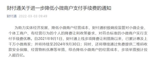 据财付通通知,自2021年9月1日,财付通上线多项降费让利措施。该活动将持续至2024年9月30日;同时,还将继续通过免费提供二维码收款安全保障、经营物料优惠等举措,综合降低小微商户的经营成本。