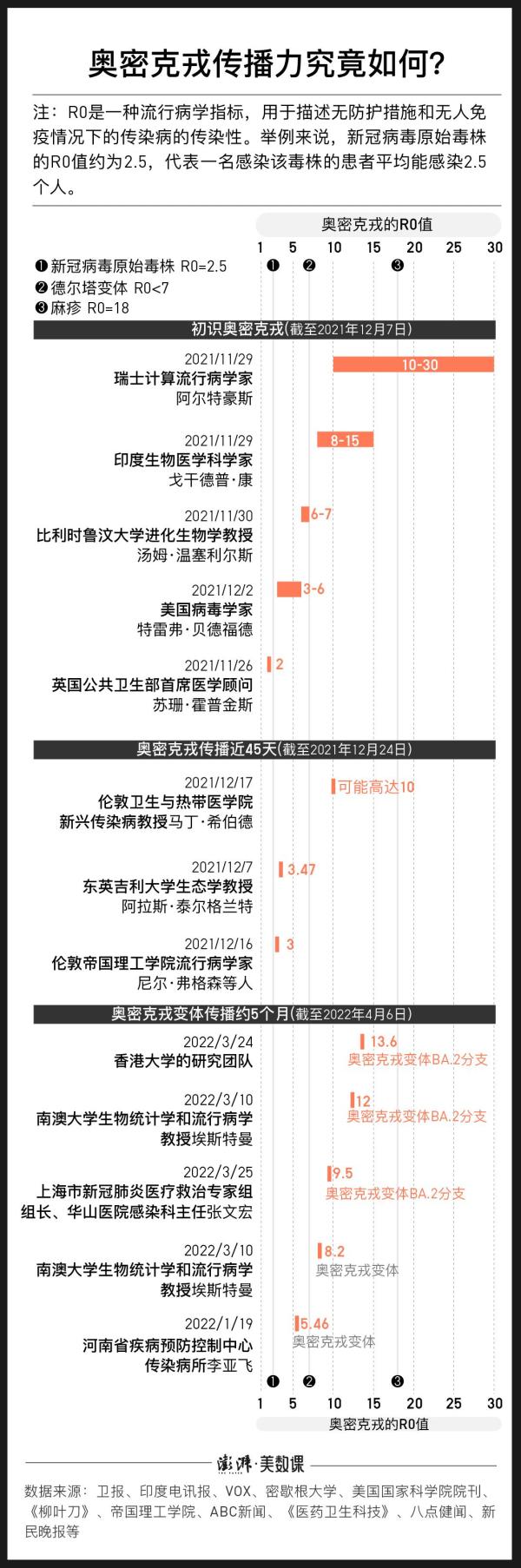 据澎湃新闻此前报道,在奥密克戎流行初期,各界人士对奥密克戎的R0值预测相对较高,差异较大。有专家认为奥密克戎的“大规模传播但不会太致命”的特性可能是新冠病毒“流感化”的转折点。但另一些专家持不同意见,认为奥密克戎的严重性仍有待观察。