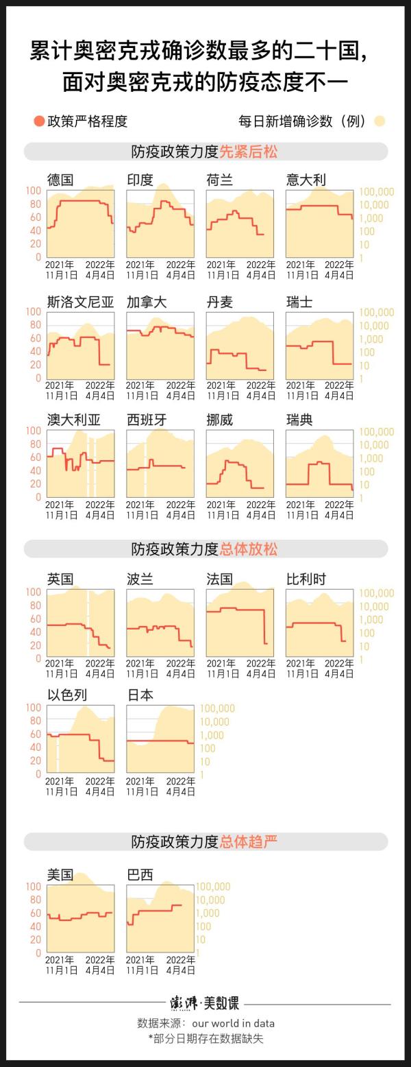 依据牛津大学布拉瓦特尼克政府学院推出的政府疫情政策“严格性指数”(Stringency Index),目前奥密克戎确诊病例最多的二十国,面对奥密克戎带来的确诊人数波动变化,采取的防控措施严格程度各有特点。