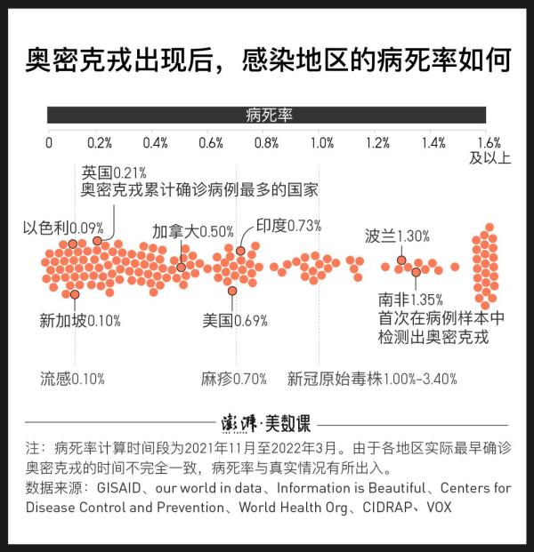 进一步分析各地疫情数据发现,仅有15个地区的奥密克戎病死率小于等于0.1%,可见奥密克戎毒株危害性仍然在一定程度上高于流感。