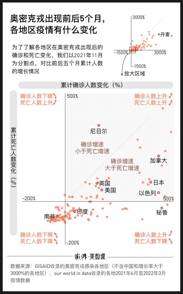 为此,澎湃新闻根据全球共享流感数据倡议组织(GISAID)中截至2022年4月2日的177个奥密克戎确诊国家,结合各地的新冠确诊人数与死亡人数,试图回答这个问题。