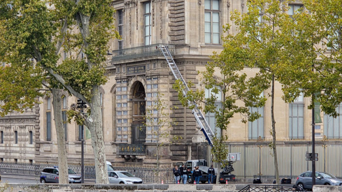 当天9时30分左右,博物馆开门仅30分钟,4名蒙面窃贼来到卢浮宫外朝向塞纳河一侧施工区(两人驾驶装载升降吊篮的工程车,另两人骑摩托车)。