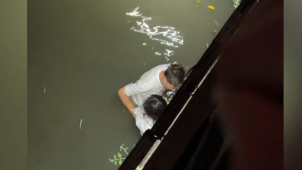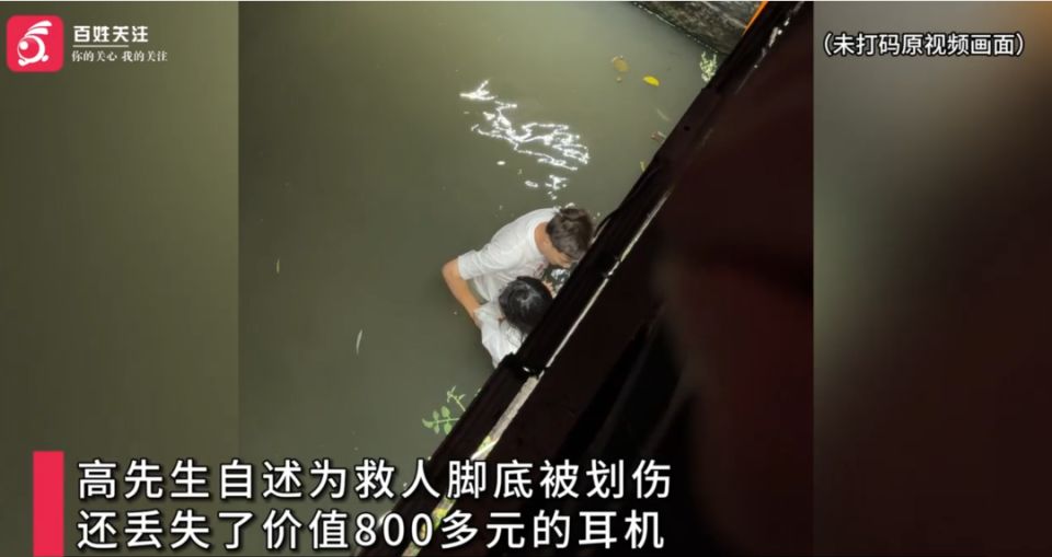 来不及多想,高先生迅速踢掉脚上的拖鞋,纵身跃入河中。