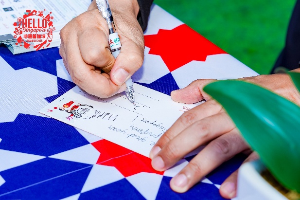 “中新邮局”打卡点前,市民李女士买了张明信片,加盖上鱼尾狮与熊猫图案的邮戳:“想寄给朋友,分享这份南洋风情。” 参与互动游戏的小朋友则围着抽奖台,期待赢得鱼尾狮玩偶、定制帆布袋等礼品。