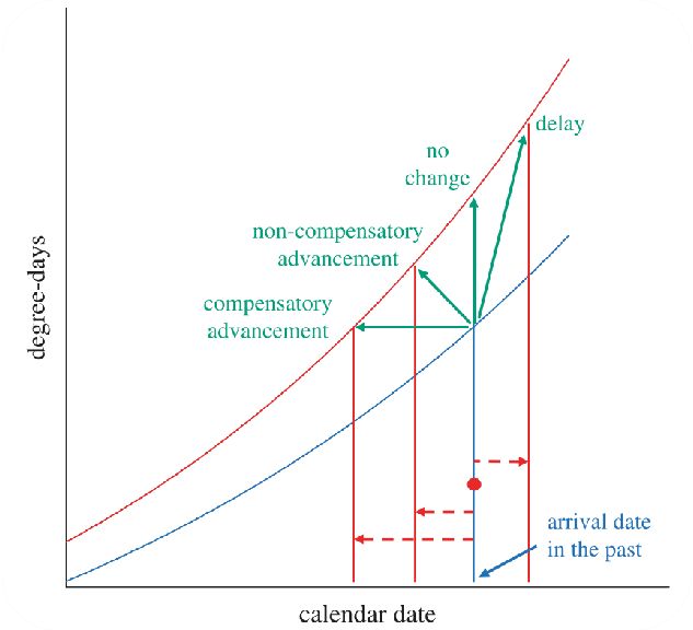 相对气候和物候变化对候鸟生态错配的潜在影响。候鸟只有大幅提前到达日期才能完全弥补气候变化带来的影响(Saino et al. 2010)。
