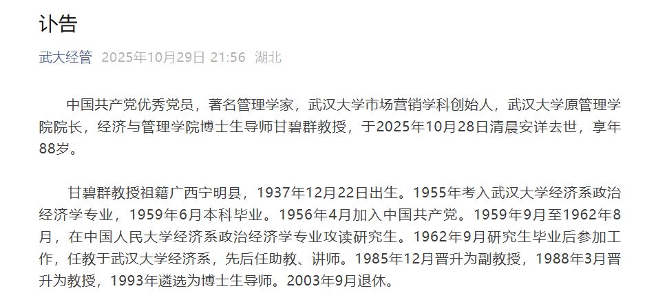 中国共产党优秀党员,著名管理学家,武汉大学市场营销学科创始人,武汉大学原管理学院院长,经济与管理学院博士生导师甘碧群教授,于2025年10月28日清晨安详去世,享年88岁。