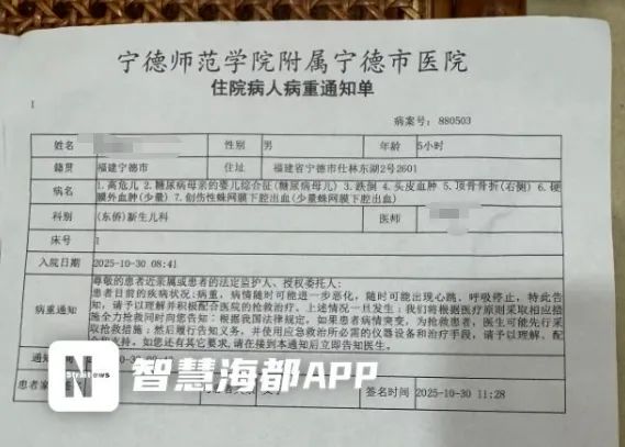 10月30日,清晨5时14分许,福建宁德师范学院附属宁德市医院,一名产妇在完成分娩后,与新生儿一同从产房转送至病房的途中,疑似因推车护栏未锁紧,就在护工松手的瞬间,推车一侧护栏突然打开,新生儿从车上坠落地面。