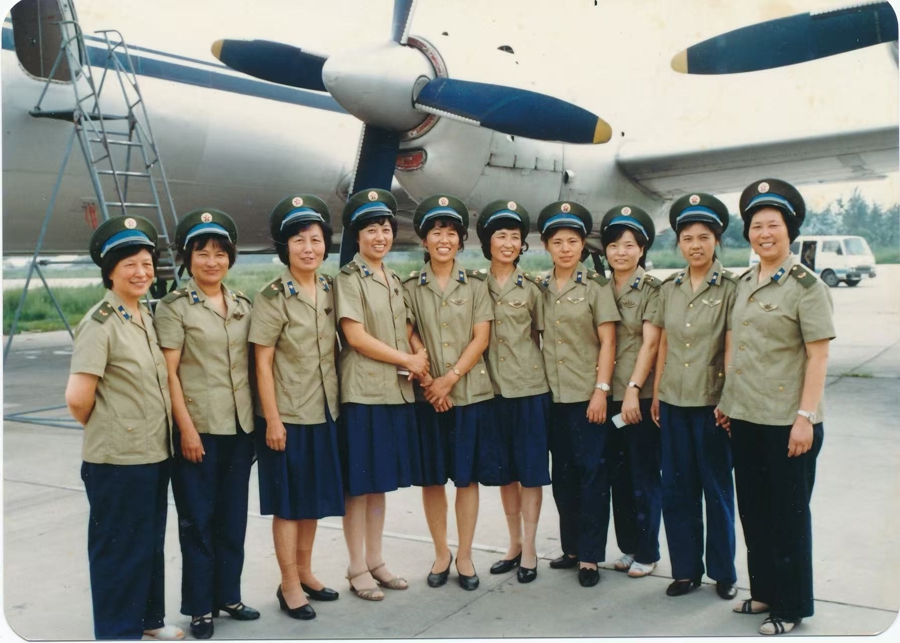 1985年,在北京西郊机场女飞行员合影,左五为底建秀