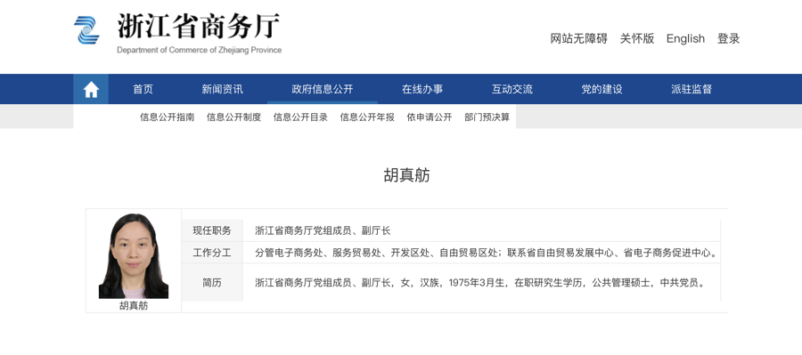 11月5日,浙江省委组织部发布省管干部任前公示通告,其中:胡真舫,女,汉族,1975年3月生,在职研究生,中共党员,现任省商务厅副厅长、党组成员,省委互联网企业工委委员(兼),拟任省直单位正厅领导职务。