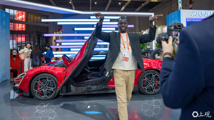 在国家会展中心5.2馆国家综合展区中国馆内,来自冈比亚QTV的记者Jatta Ousman对中国制造的纯电超跑比亚迪仰望U9表现出浓厚兴趣,在现场进行了详细报道。