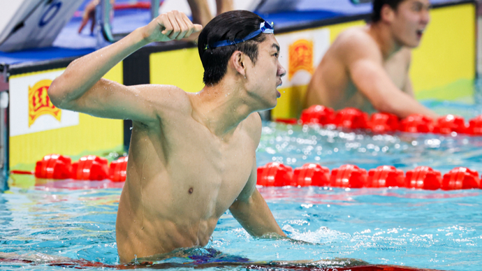 400米自由泳赛后,张展硕激情挥拳庆祝(王竟成摄)