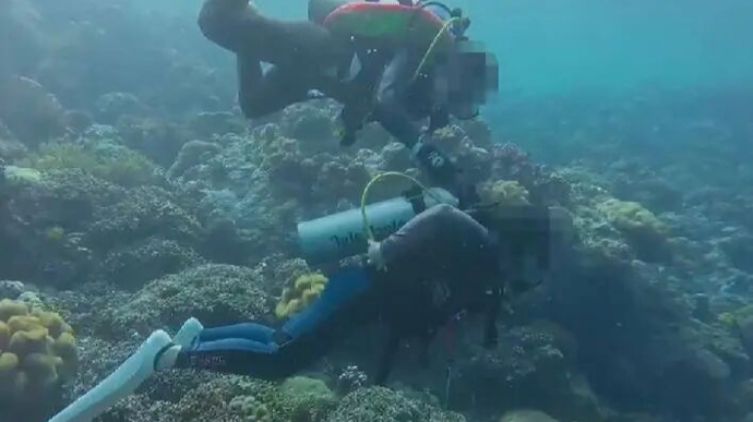 其中,一段时长约44秒的视频显示,一名潜水员正面对镜头摆出“比心”动作,身后有另一名潜水员伸手对其气瓶进行操作。随后,被操作气瓶的潜水员疑似察觉异常,迅速更换至备用二级头。
