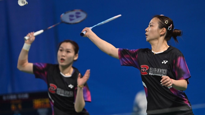 11月12日,浙江队组合黄雅琼(右)/郑岚在女双比赛中回球。她们2比0战胜北京队组合王漪朵/李嘉嘉。
