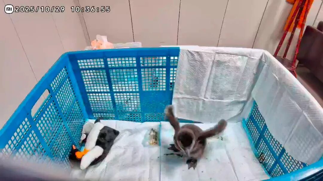 一个身披灰褐色绒毛的小生命,正在长风海洋世界的后场保育区里,一摇一摆地探索着它的世界。它身材圆润,叫声细嫩,走起路来像个不稳的毛绒玩具,还会和饲养员撒娇卖萌。