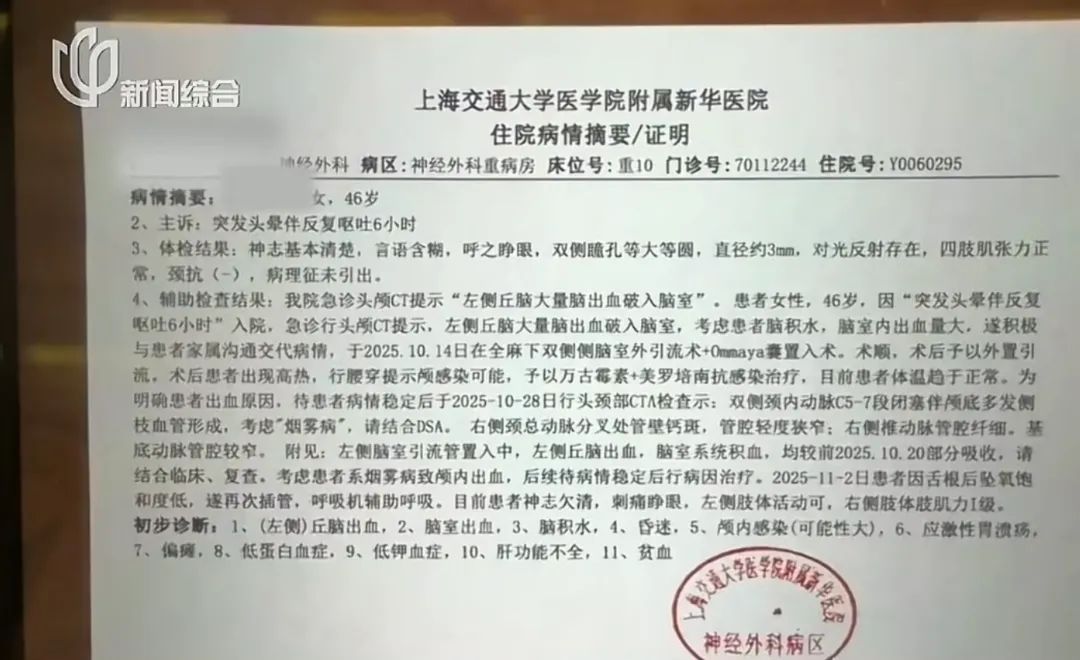 原标题:《46岁上海独身女子突发昏迷!远房亲戚赶来签字手术,医药费已超21万元》
