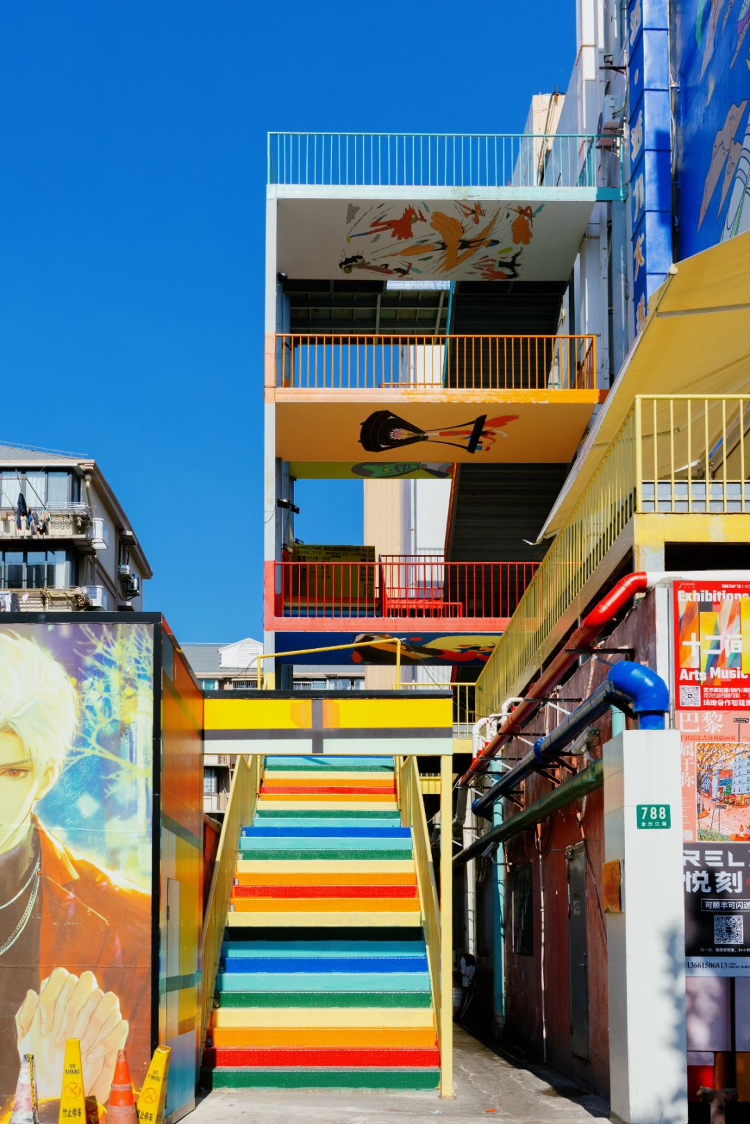 这处彩虹楼梯诞生于对和胤788广场的改造。这里原本是普通的建筑外梯,在设计师的巧思下,被赋予了彩虹的色彩。总高5层楼的扶梯并非单一的直梯,而是由多层交错的楼梯组成,金属材质的台阶与栏杆构建出富有层次的几何空间。