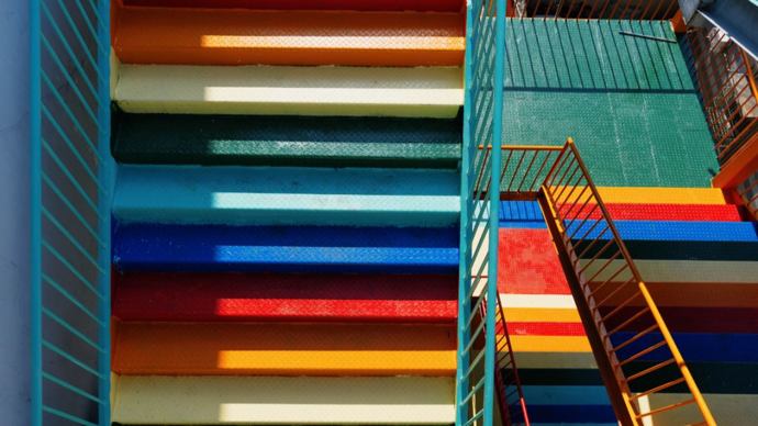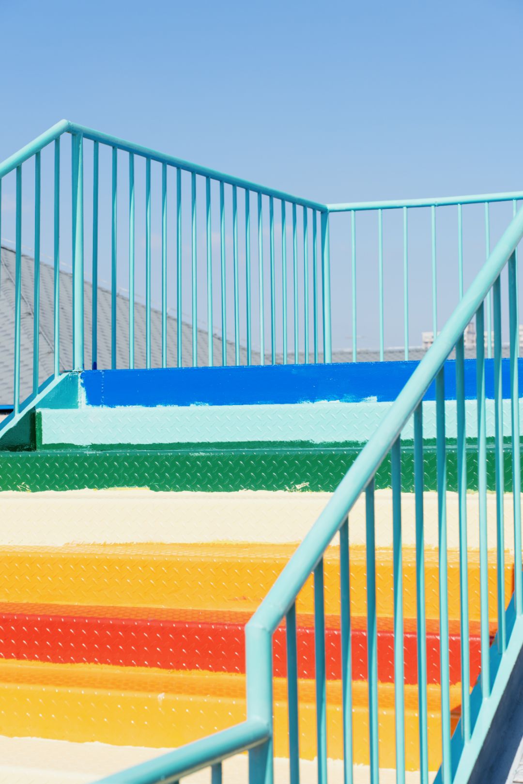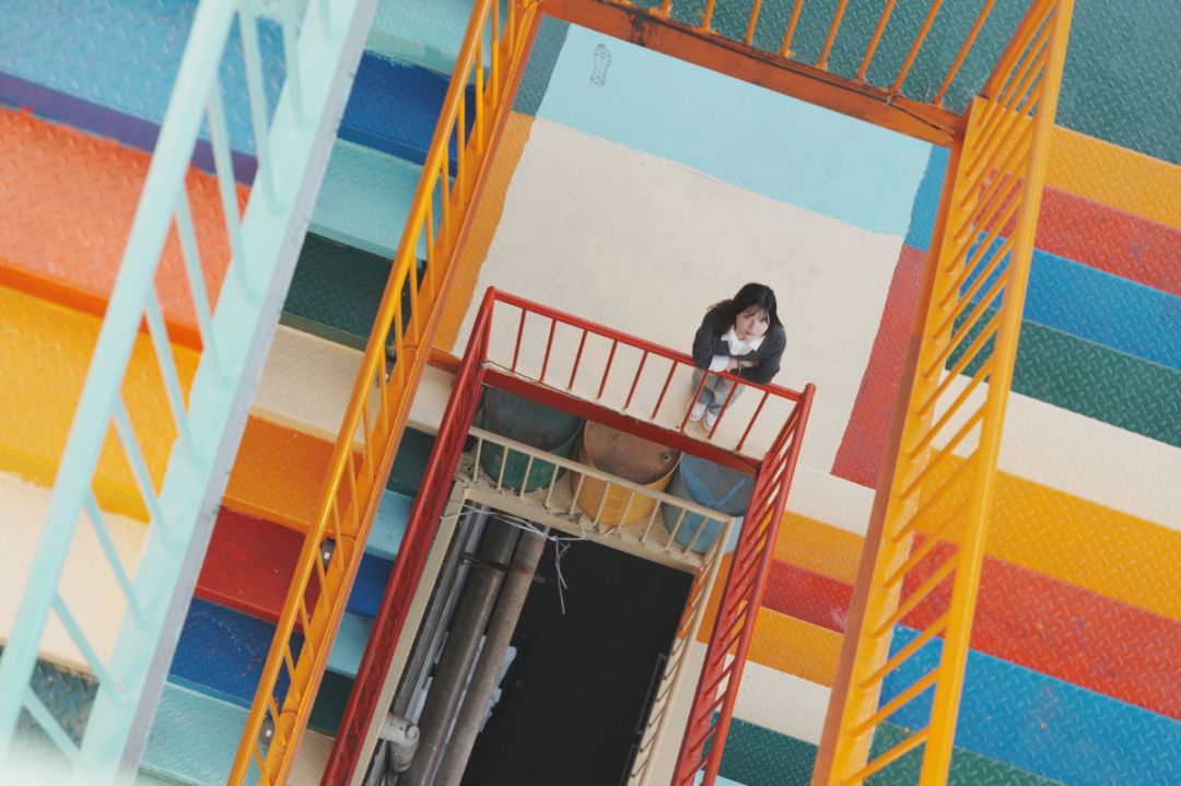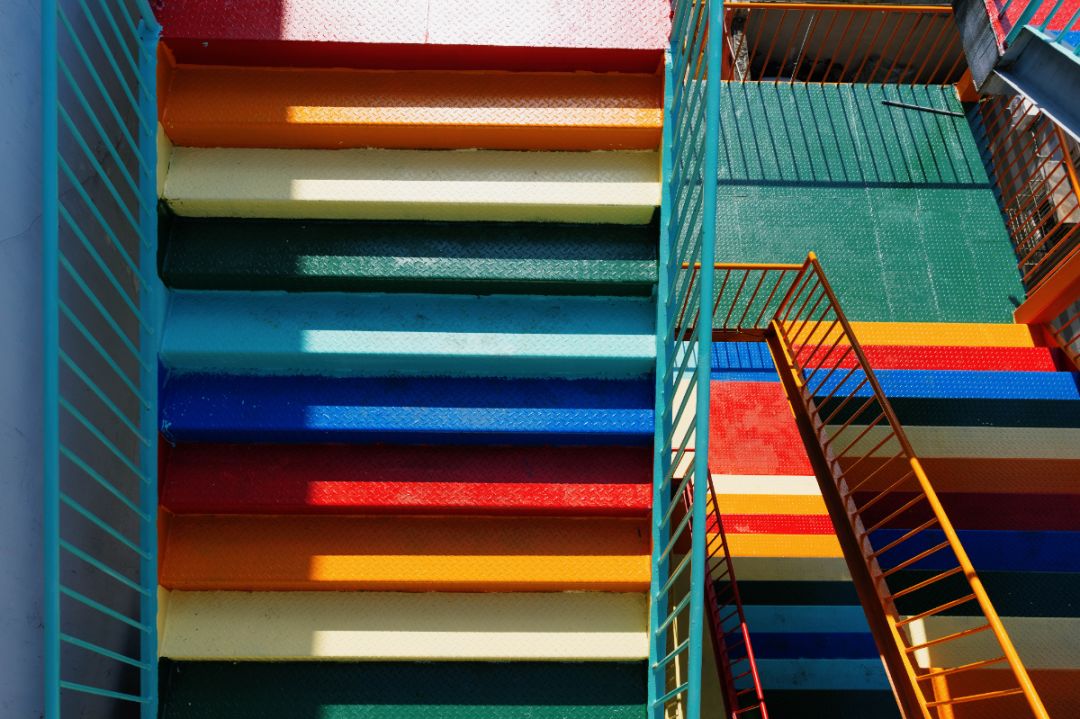 楼梯以红、橙、黄、绿、青、蓝等彩虹色系为主,每一级台阶都被精心涂上不同的颜色,宛如将天边的彩虹截取一段,安放在城市之中。