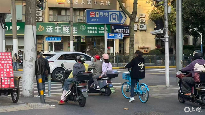 新民晚报记者实地探访发现,常德路上的路牌指向南北,澳门路的路牌指向东西,该交叉路口存在特殊通行情况:西侧段澳门路设有机动车禁行标志,仅允许行人和非机动车通行。沈女士介绍,这是不少孩子上下学的必经之路,她常带孩子从西侧澳门路横穿常德路,“这里一直是人车混行,电瓶车通行速度快,为了安全我们会尽量避让,但让完车,绿灯时间就不够用了。”她表示,西侧澳门路对应的行人绿灯仅15-16秒,避让车辆后往往来不及完成过街,只能与非机动车抢道,风险极高。