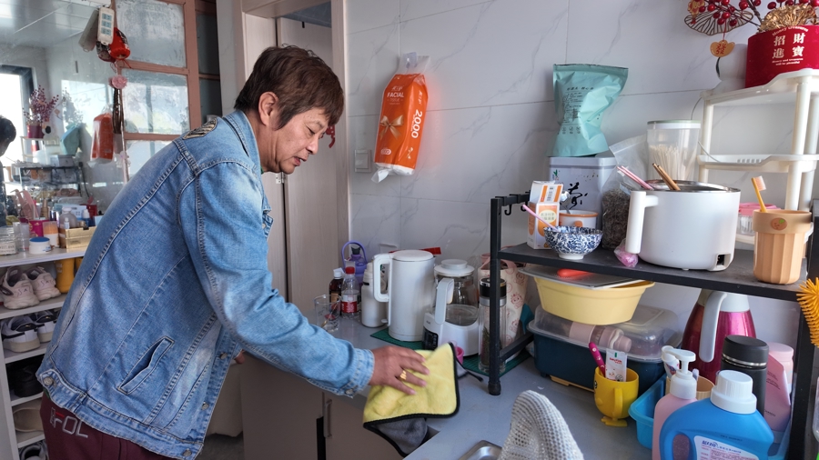 图为居民蔡金福正在整理自家的独立厨卫。/王嘉旖摄