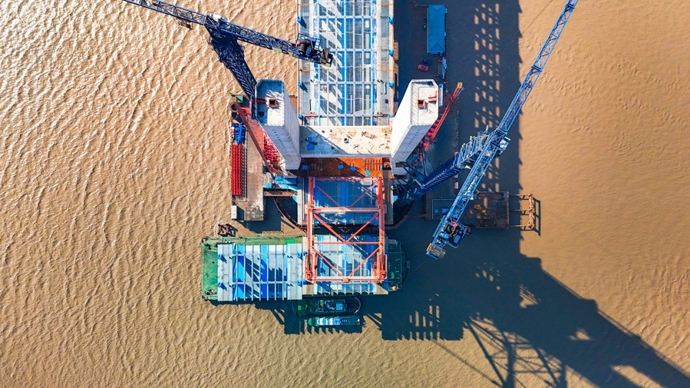 据悉,崇启公铁长江大桥非通航孔共有11个桥墩,顶推长度为1205.4米。钢梁在工厂完工后通过水上运输船运到大桥南岸预拼场进行吊装组拼,再分13个轮次(其中9个轮次为112米)向主通航孔方向顶推。此次是最后一轮的吊装顶推作业,因进入寒潮大风天,加上施工时间长,精准要求度高,叠加潮汐落差大、瞬时风力强等复杂水文气象条件,安全风险极高。