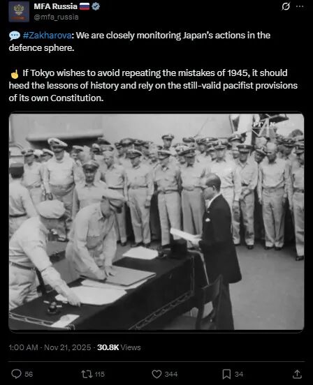 俄罗斯外交部发帖称,“如果东京希望避免重蹈1945年的覆辙,就应该吸取历史教训,依靠本国宪法中仍然有效的和平条款。”
