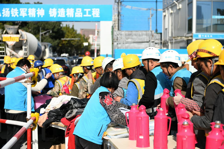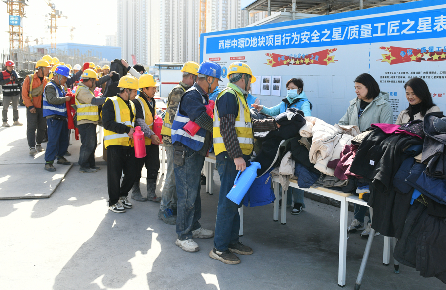 室外活动现场,长桌上整齐陈列着冬衣、毛毯、保暖手套、防护口罩、暖水瓶、热水袋等生活用品,琳琅满目却井然有序。下班时分,工友们有序排队,根据自身需求领取物资,脸上的笑容与现场的氛围相映,一派欢乐祥和的景象。
