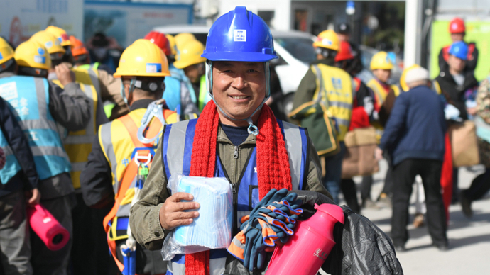 “红围巾真好看,想着过年回家戴呢。”来自江西九江的塔吊指挥工黄春霞,手提着新发的毛毯,抚摸着颈间的围巾,脸上洋溢着灿烂的笑容。
