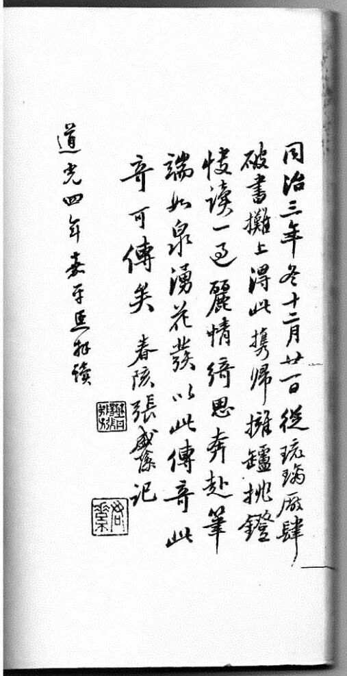 与铁面御史的形象不符,张盛藻其实是个多愁善感的人,对才子佳人类的小说、戏剧都颇有兴趣。他常去琉璃厂书肆淘书,一见所爱便欣然忘食。鲁迅先生就曾收得一本他收藏的《梅花梦》(“同治三年冬十二月廿一日从琉璃厂肆破书摊上得此携归”),见识了一回这位御史的绮念柔肠。